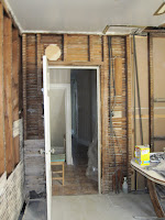 Speaking of the Laundry/makeshift kitchen, the washer and dryer were to arrive on Saturday. We were so excited to finally have an opportunity to do laundry at home without having to hang with the crackies for a change. The delivery guys shows up with his "I smoke 8 packs a day" voice acting like he's doing this for free, does some measurements only to let us know that the washer and dryer we've been waiting for does not fit. Then he steals our precious Lawn toilet flush handle thingie and takes off like a bat out of hell, with our W/D. Crap! And so we go back to the drawing boards to look for a smaller W/D but after looking in a few locations, we decided to see if we can break some more stuff down, mainly a door way to see if that gives us the space we need to keep our original machines.